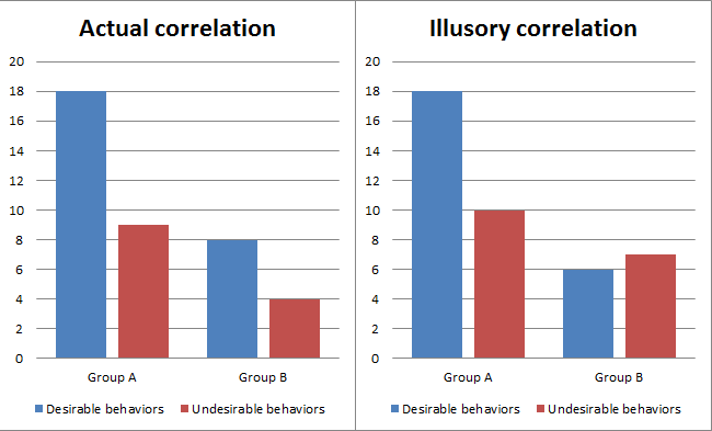 Even though there was no correlation between group membership and the proportion of positive and negative information, participants perceived a correlation. As the figure below shows, participants overestimated the frequency with which Group B, the “minority group” (who where only described has a much as the “majority group”) and the undesirable actions (which occurred only half as much as desirable behaviors) were both distinctive aspects of participants’ social perceptions.
